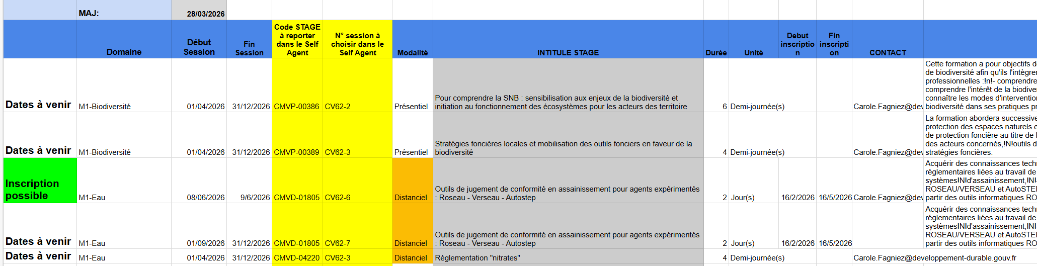 • Le code stage de la formation qui doit être saisi dans le Self Agent, apparaît dans la 5ème colonne jaune