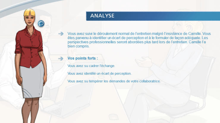 Pour chaque séquence, une mise en situation vous est proposée. Vous devrez ainsi aider le manager. La suite de l’histoire s’adaptera à votre réponse…et vous pourrez recommencer, tester d’autres solutions autant que vous souhaitez ! Chaque option que vous choisirez donnera lieu à une analyse et à un rappel des points à retenir.